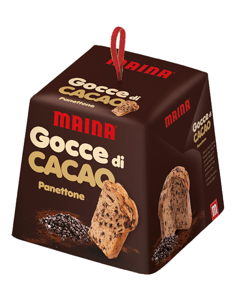 Pandoro suave con levadura natural, enriquecido con muchas gotas de chocolate negro puro en la masa.